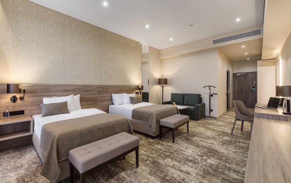 В номере: вешалка, диван, зеркало, кресло, кровать двуспальная, прикроватные тумбочки, стол, шкаф, мини-холодильник, сейф, телевизор ЖК, телефон, чайный набор посуды, электрочайник