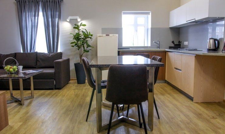 В номере: кровати односпальные /одна двуспальная кровать, прикроватные тумбочки, стол, стулья, диван, шкаф, мини-кухня, набор посуды, сейф, сплит-система, телевизор, телефон, холодильник, чайный набор посуды, электрическая плита, электрочайник