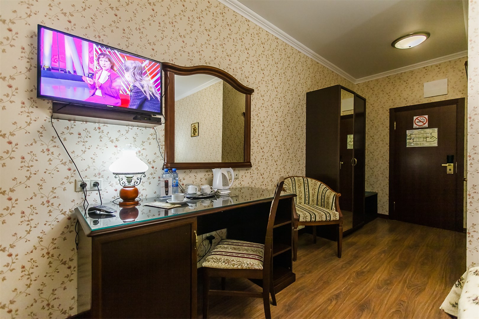 В номере: две односпальные (90*200 см.) кровати – трансформеры, сдвигаются без шва, тв цифровое, телефон, кондиционер, мини-холодильник, письменный стол, стул, зеркало, настольная лампа, бра, туалетный стол, пуф, комод-буфет, диван раскладной, кресло, гардероб с вешалками, вешалка для верхней одежды, багажница, чайник, кофе-машина
