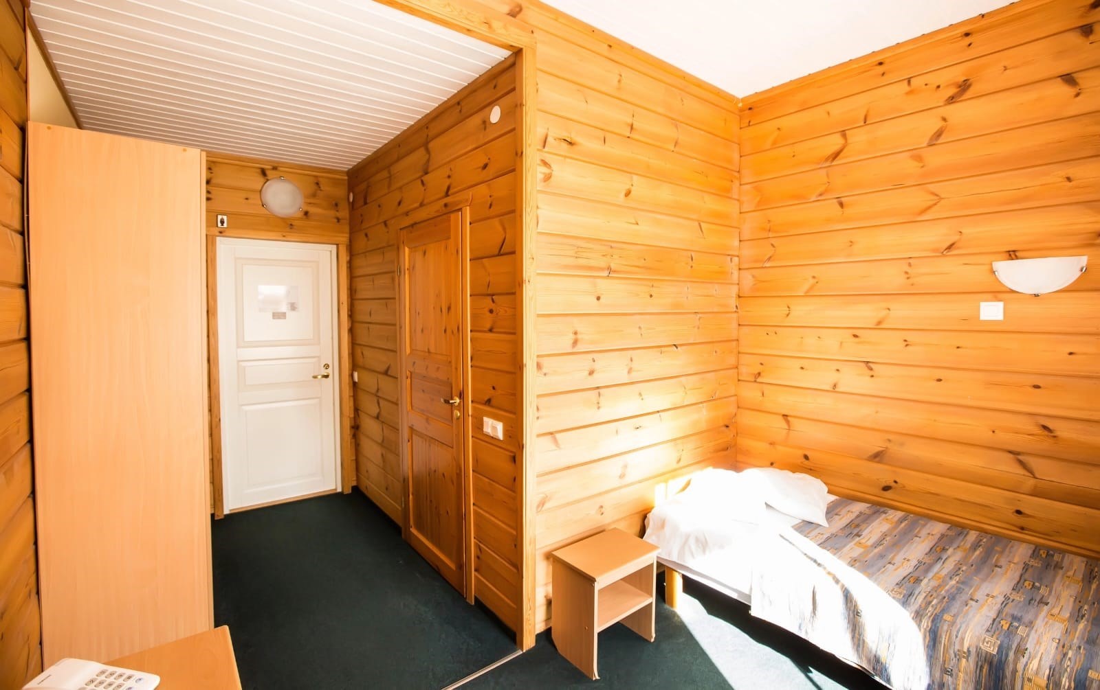 В номере: кровать односпальная, прикроватная тумбочка, стол, шкаф, телевизор, телефон