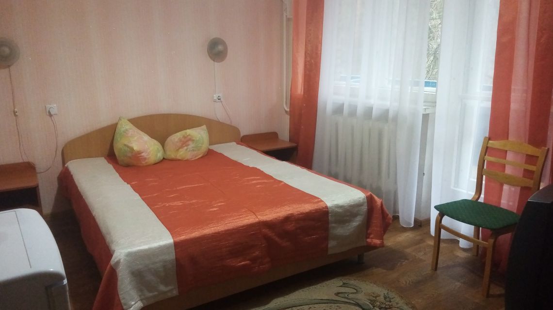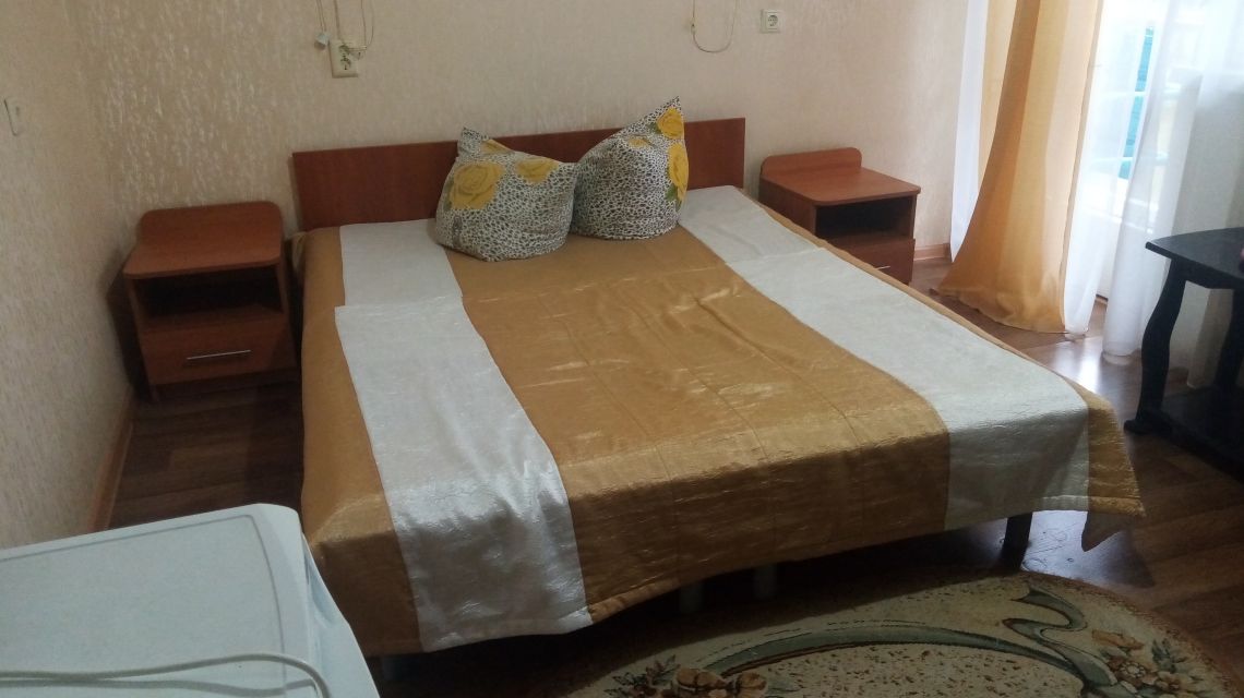 В номере: двуспальная кровать, прикроватные тумбы, стул, стол журнальный, шкаф, холодильник, телевизор, набор посуды