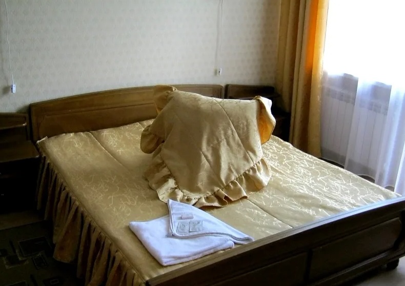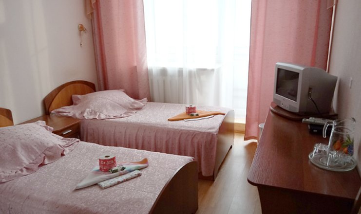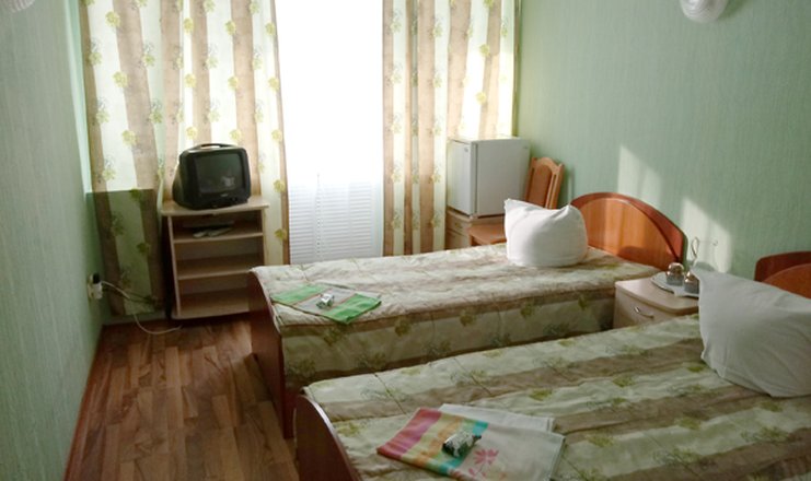В номере: две кровати односпальные, прикроватные тумбочки, стол, стулья, шкаф-купе, набор посуды, телевизор, холодильник