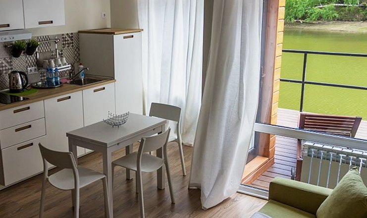 В номере: Кухня, вешалка, зеркало, комод, кровать двуспальная, кухонная мебель, стол, стулья, шкаф, микроволновая печь, набор посуды, телевизор, чайный набор посуды, электрочайник
