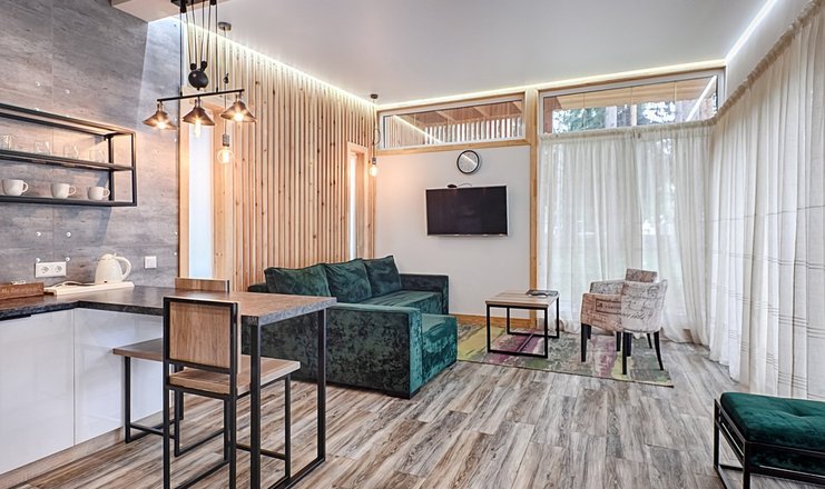 В номере: Кухня, вешалка, диван раскладной, зеркало, кровать 2-спальная, мягкая мебель, прикроватные тумбочки, стол, стулья, шкаф, кондиционер, микроволновка, мини-холодильник, набор посуды, плита электрическая, сейф, ТВ, телефон, чайный набор посуды, электрочайник