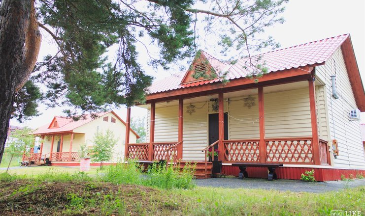 В коттедже: кровати односпальные, кровать двуспальная, стол, столик журнальный, стулья, шкаф, мягкая мебель, обеденный гарнитур, микроволновая печь, телевизор, холодильник