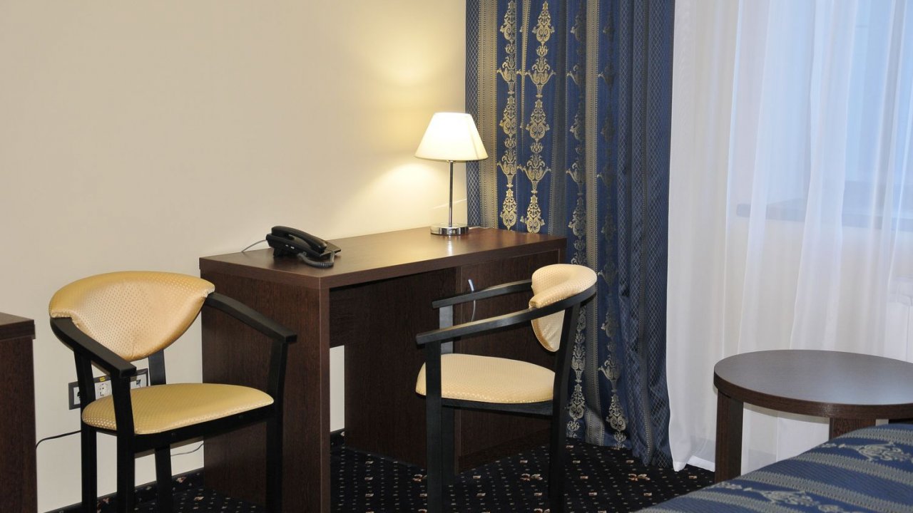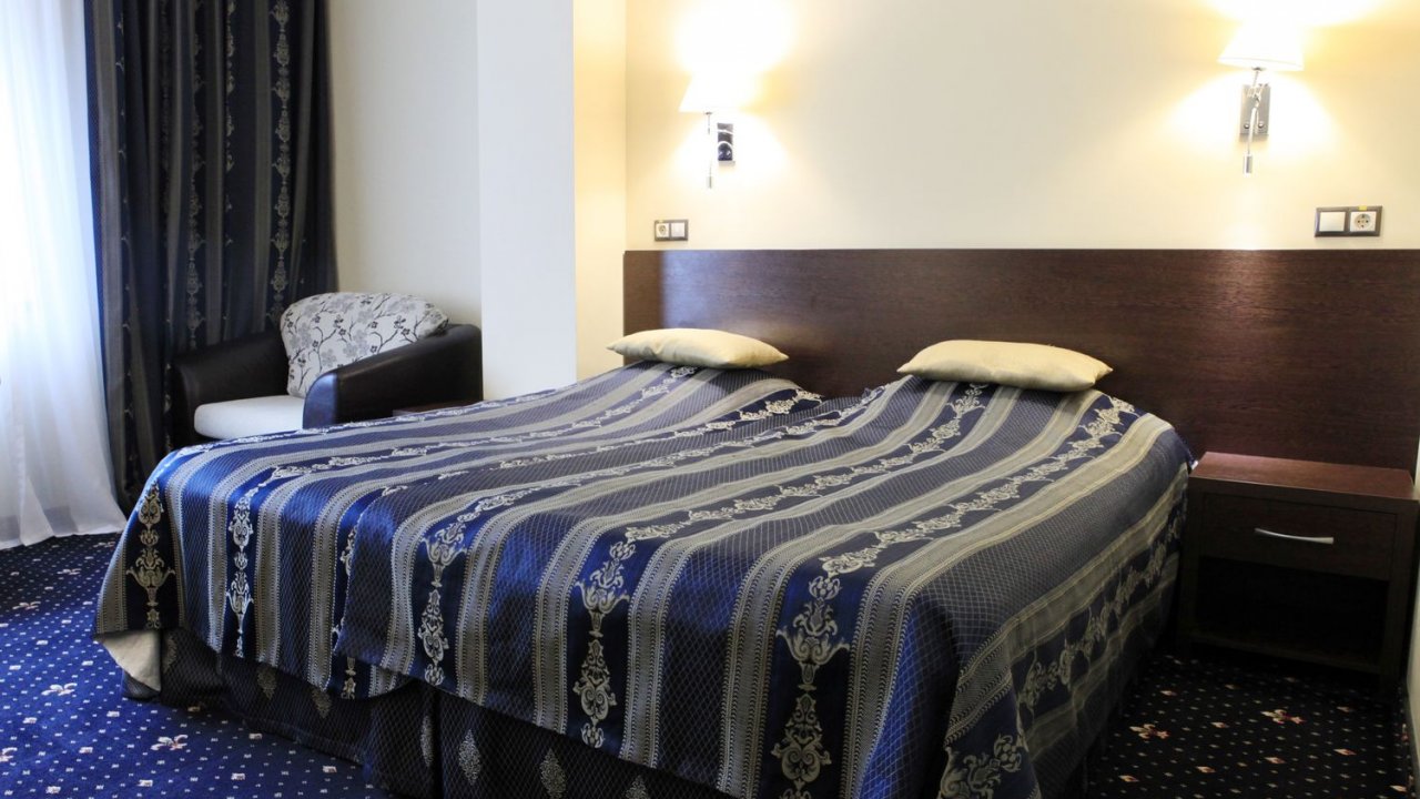 В номере: две удобные отдельные кровати (100х200 см), которые при необходимости легко можно соединить в одну двухспальную (200х200 см), две тумбочки, журнальный столик, два стула и письменный стол, настольная лампа, шкаф с зеркалом, ЖК телевизор, телефон, стеллаж, мини-бар, электрический чайник,   набор посуды, сейф, бесплатный wi-fi, кондиционер