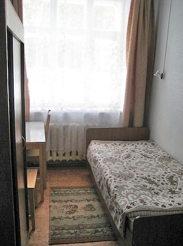 В номере: односпальная кровать, телевизор, холодильник, журнальный столик, прикроватная тумба, шкаф, чайник.