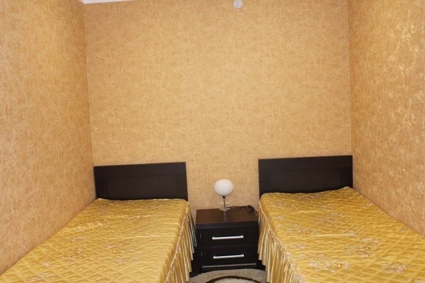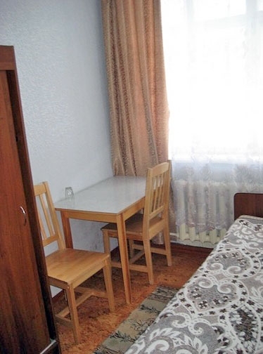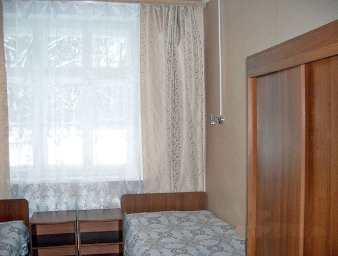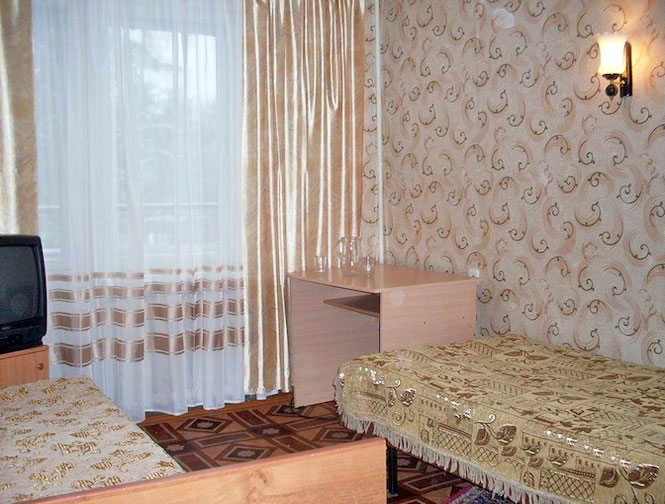 В номере: две односпальные кровати, телевизор, журнальный столик, платяной шкаф.