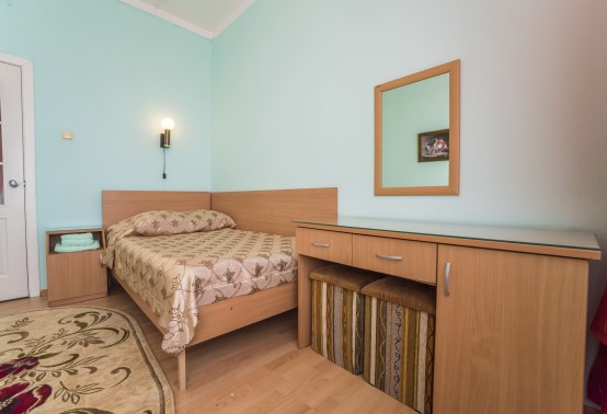 В номере: две односпальные кровати, прикроватные тумбы, встроенный шкаф, стол, кресло (или стул, или пуф), телевизор, холодильник, телефон, набор посуды